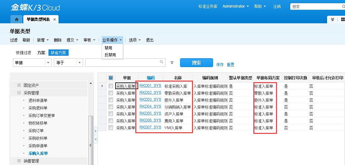 打开【采购入库单】功能,切换不同的“单据类型”,看效果吧。