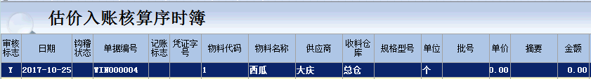 进入估价入库核算后,系统会调出本期所有没有单价的入库单,并且按照预估价格填入单据中。